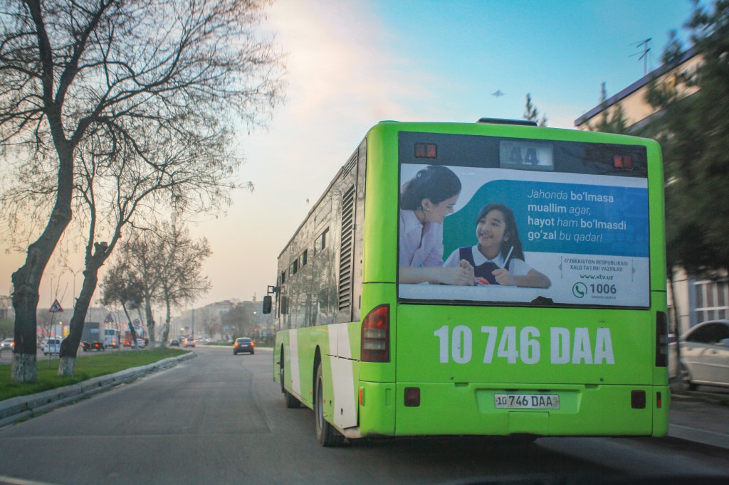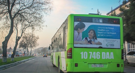 «В столице Узбекистана в общественных автобусах появились социальные рекламы, которые напоминают общественности о важности профессии учителя», - говорится в сообщении пресс-службы министерства.