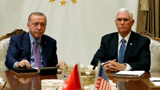 17 октября Пенс и Эрдоган встретились в Анкаре, чтобы обсудить начатую на прошлой неделе турецкую военную операцию в Сирии После продлившихся четыре часа переговоров вице-президент заявил, что глава государства Дональд Трамп готов отозвать экономические санкции в отношении Турции по мере реализации договоренностей о прекращении огня на северо-востоке Сирии,
