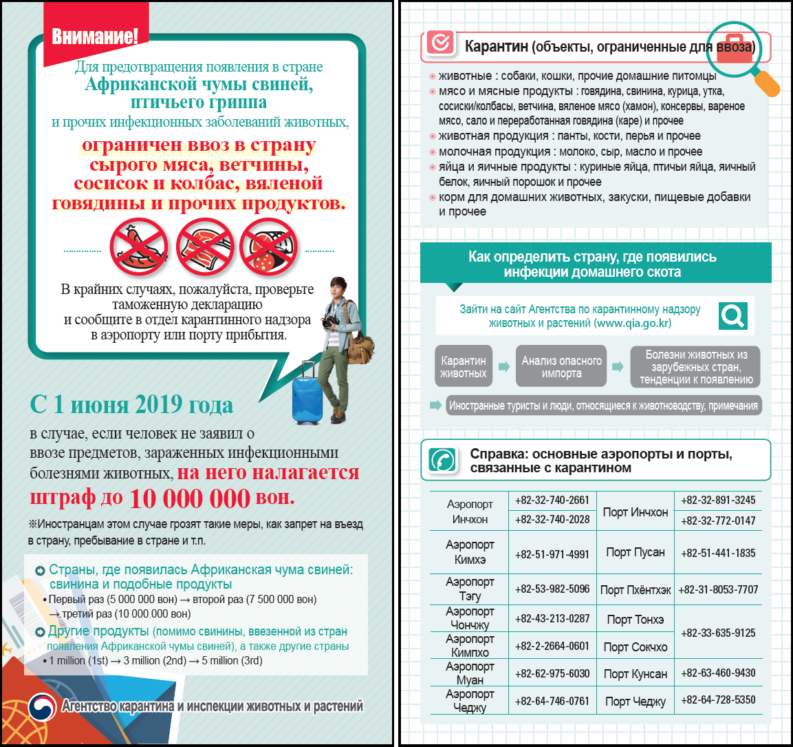 Қайд этилганидек, Корея Республикасига юқорида кўрсатилган гўшт маҳсулотларини ноқонуний олиб киришга уриниш бўлган тақдирда, 5 миллион Корея вони ($1=1155,57 вон) миқдорида жарима солинади. Жарима тўланмаслиги мамлакатга 5 йил муддатга қайта кириш тақиқланишига олиб келади.