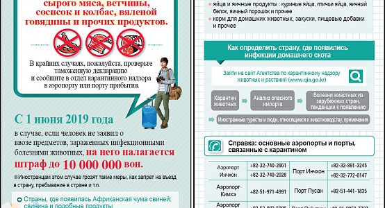 "Корея Республикасининг карантин ҳамда ҳайвон ва ўсимликлар инспекцияси агентлиги мамлакатда Африка чўчқа гриппи ва парранда гриппи тарқалишининг олдини олишга қаратилган чора-тадбирлари доирасида 2019 йилнинг 1 июнидан бошлаб мамлакатга гўшт маҳсулотларини олиб киришни тақиқлади", - дейилади ТИВ матбуот хизмати хабарида.