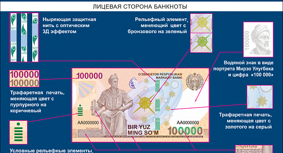 “Ўзбекистон Республикаси Марказий банки 2019 йилнинг 25 февралдан бошлаб қиймати 100 000 сўм бўлган банкнот кўринишидаги янги пул белгиси муомалага чиқарилиши тўғрисида маълум қилади”, - дейилади банк назоратчисининг хабарида.